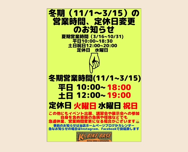 11月の営業日と冬期営業時間及び定休日変更のお知らせ
