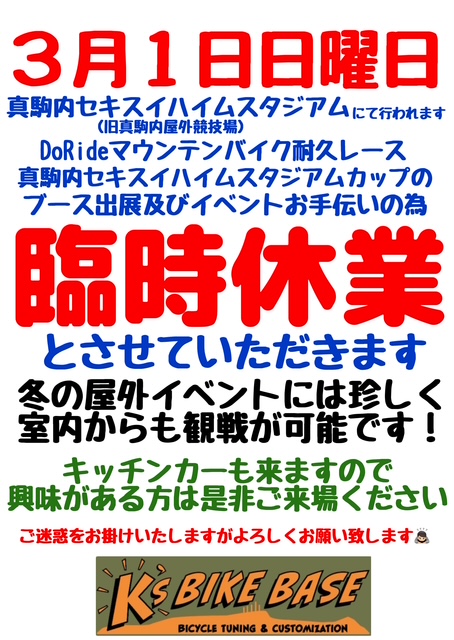 3月1日日曜日真駒内セキスイハイムスタジアムで開催されますDoRideマウンテンバイク120分耐久レース真駒内セキスイハイムスタジアムカップに出展&お手伝いの為臨時休業とさせていただきます。