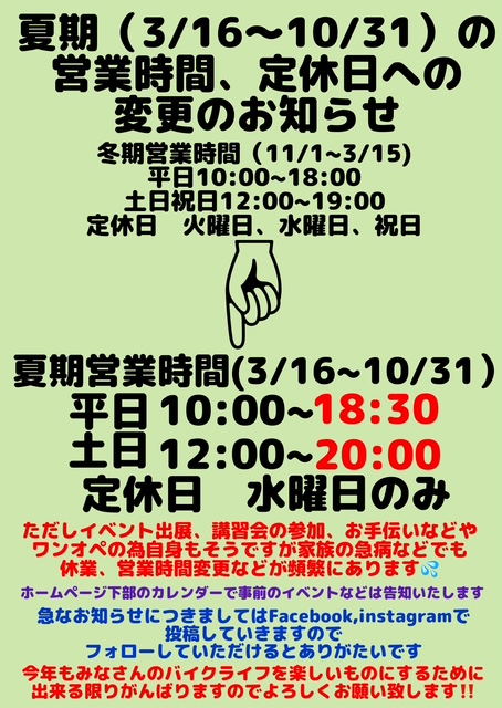 3月16日より夏期営業時間となりますのでよろしくお願いいたします!